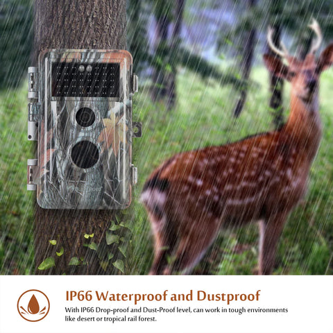Camo design gör kameran smygande för vilda djurobservationer och forskning av vilda djur; idealisk för ridning, camping och utforskande som sportkamera, även som säkerhetskamera för hem och kontor. Drifttemperaturen är mellan -4~+140°F/-20 ~+60°C. Lång batteritid på fältet i standby-läge, upp till 3 - 6 månader med 8*AA-batterier och automatisk avstängning på 5 minuter utan knappsatsstyrning, mer energieffektiv.